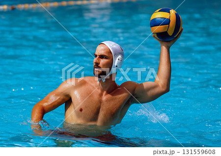 Male water polo player throwing ball in dynamic action during competitive match in pool