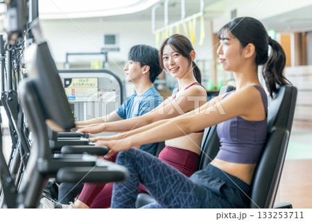 スポーツジムでトレーニングをする若い男女 撮影協力:スポーツクラブ&サウナスパ ルネサンス 幕張24