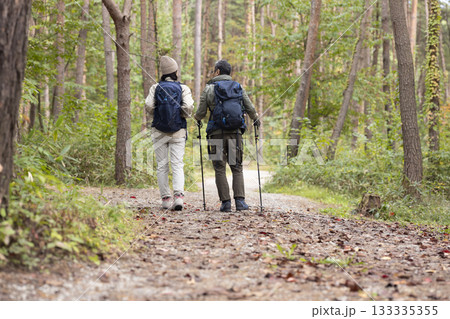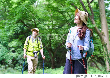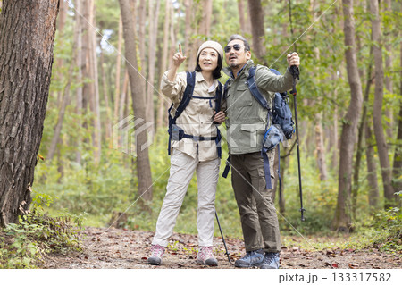 ハイキングをするミドル夫婦