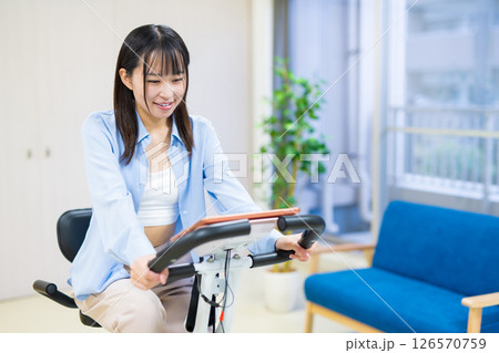 自宅の部屋でフィットネスバイクで運動する女性 家 エアロバイク 運動