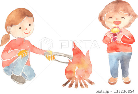 水彩で描いた焚火と焼き芋のイラスト ベクター