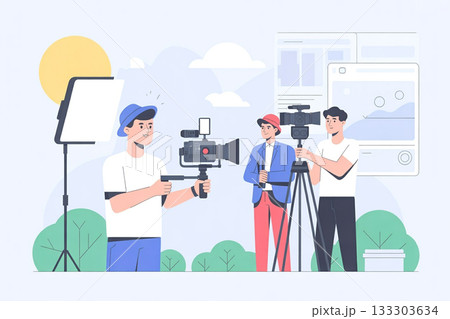 ストックフォトの仕組みと流れのイラストセット(撮影・販売・利用イメージ)