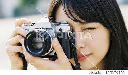 ヴィンテージフィルムカメラを持つ女性