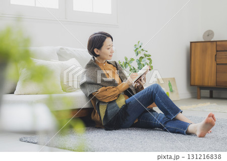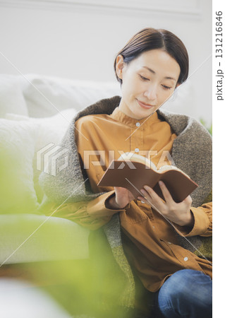 緑溢れるインテリアに囲まれてソファーに座りながら読書する女性