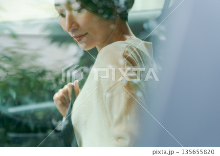 車に乗りながら座席から身を乗り出す赤いニットの若い女性