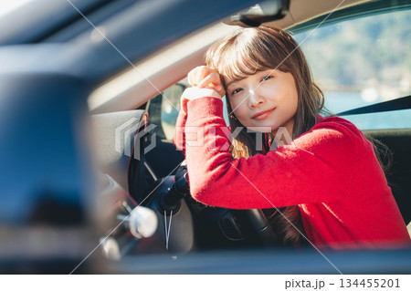 青空のもと運転席に乗る赤いニットのセーターを着た若いロングヘアの女性