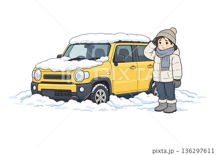 家族でアウトドアを楽しむ様子を描いた人物と車のイラスト素材
