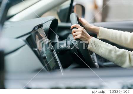 車の助手席に乗り楽しそうにするロングヘアの若い女性