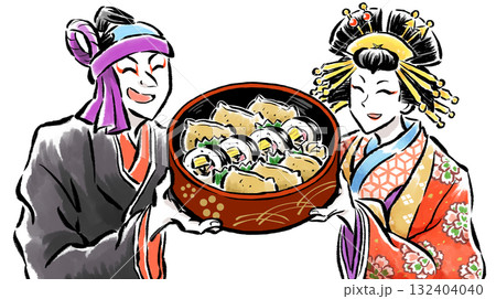 仲良く助六弁当を持つ助六と揚巻(歌舞伎)