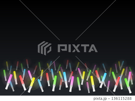 ライブ・コンサート会場の背景イラスト 暗闇で光る色とりどりのペンライトとスポットライトのステージ装飾