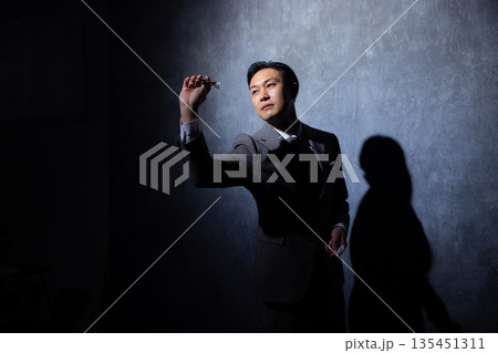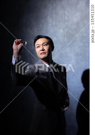 黒い背景でダーツを構えるスーツの男性