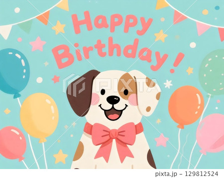 ハッピーバースデーの文字と楽しい犬のイラスト(AI生成)