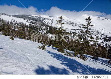 鳩待峠から至仏山へ向かう途中から見る樹氷と上州武尊山