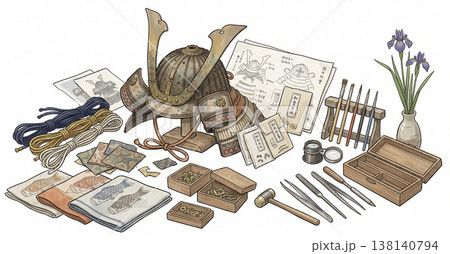 端午の節句の兜制作道具と材料を並べた和風イラスト