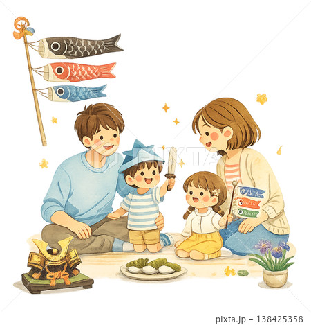 端午の節句を祝う男の子とゴールデンレトリバーと子猫のイラスト