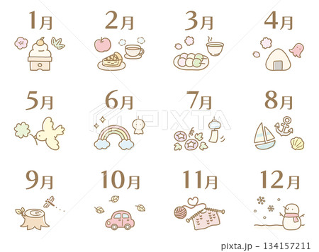 季節のイラスト、カレンダーのタイトル、12ヶ月のかわいいイラスト素材のセット02