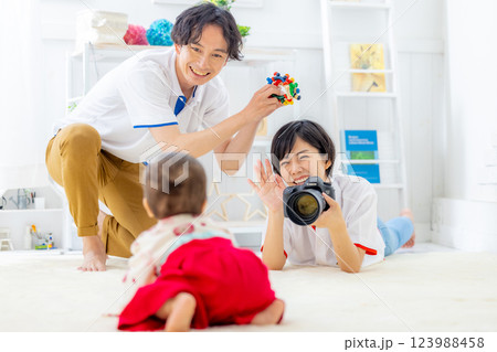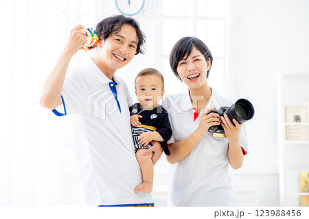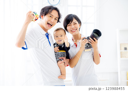 お宮参りで息子を抱き上げ喜ぶ父と子