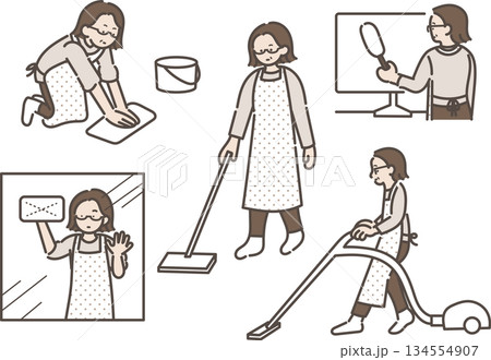 家の掃除をする40代女性のイラスト素材セット 線画のみ