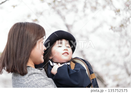 桜と入園式を迎えた3歳の女の子と母親