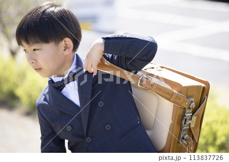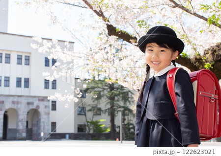 駐車場でランドセルを背負う小学1年生 入学イメージ