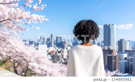 春の訪れ 桜と都会の景色を眺める女性 16:9サイズ AI生成素材