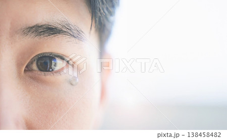 悲しみや感動で目に涙を浮かべる若い男性のアップ