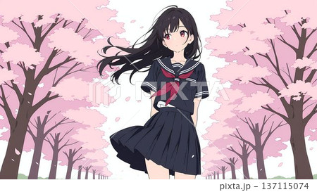 春の陽気な風と桜に包まれた制服姿の女子学生イラスト|卒業・入学・感動・笑顔・青春・花束
