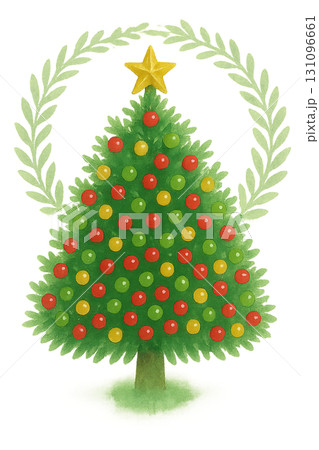 リースに囲まれた星付きクリスマスツリーのイラスト素材(PNG切り抜き)