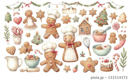 ジンジャーブレッドのかわいい水彩クリスマスイラストセット(白背景)