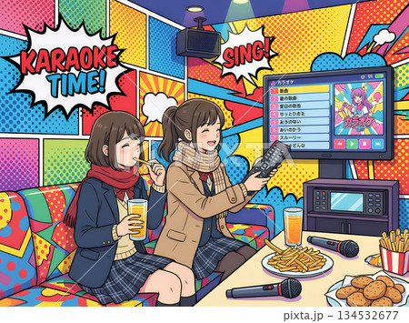 きらめく雪、冬の学生たちのアニメ風イラスト、右に余白