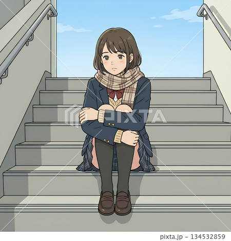 冬の晴れ間、空を見上げる高校生または中学生の女の子のアニメ風イラスト、左に余白