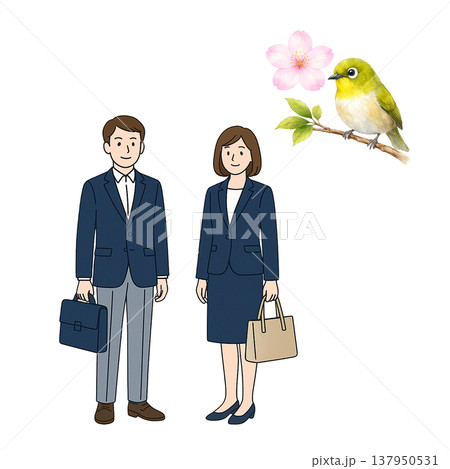ビジネス男女 小鳥 新生活 春 水彩イラスト素材