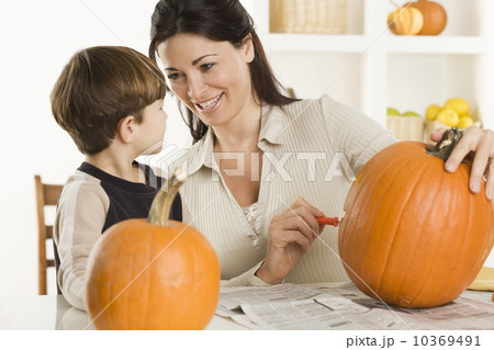 Mother and son carving pumpkins