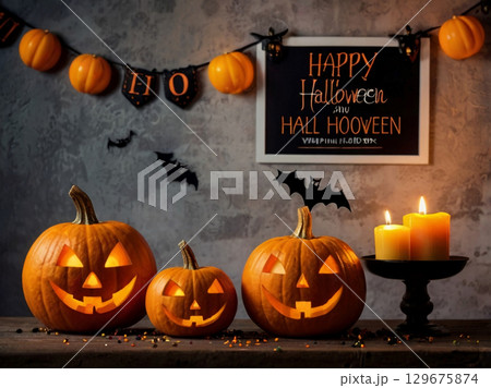 ハッピーハロウィンの文字とジャックオランタン