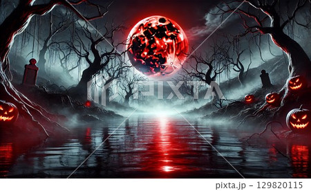 不気味なハロウィンの血の川と骨の木々