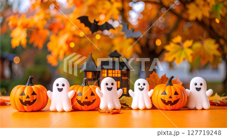 ハロウィンの背景 並んでいる可愛いおばけとおばけかぼちゃ