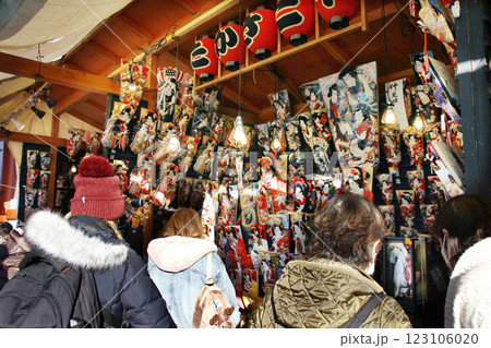 日本の年末の伝統行事。羽子板市には子供、孫に羽子板を求める人々と屋台での食べ歩きを楽しむ人と