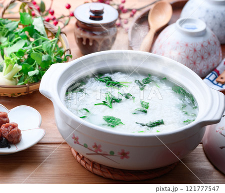 七草粥 土鍋で炊いた七草がゆを炊く 料理シーン