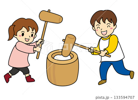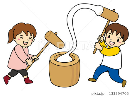 お餅つきをする女の子と男の子のイラスト