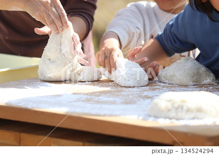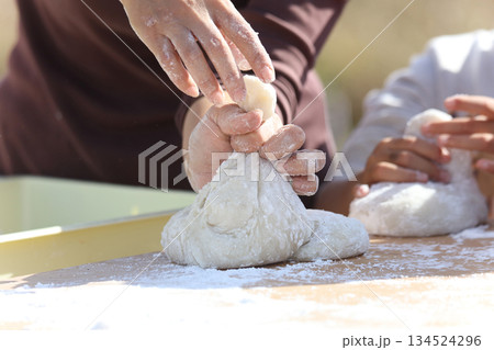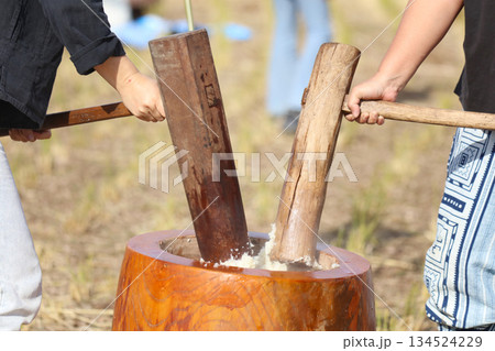 餅つきをする親子 杵と臼で餅をつく人 餅をつく子どもと大人 イメージ素材