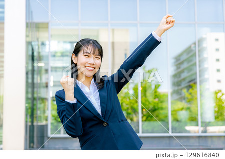 スマートフォンを見てガッツポーズをする若い女性・ビジネスウーマン
