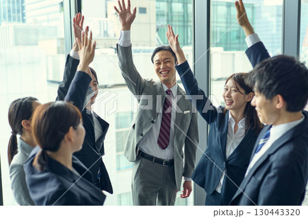 新緑の窓が綺麗なオフィスでビジネスマンのガッツポーズのカメラ目線 達成や成功のイメージ