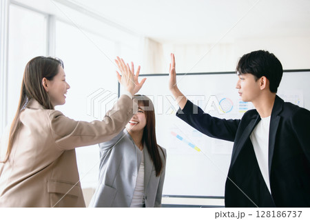 ハイタッチで成功や成果をあげる笑顔のビジネスマン2人 プロジェクトの成功などのポシティブ男女