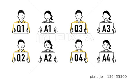 質問する作業着の中年男性と回答するエキスパート、Q&Aボードを持つ人物アイコンセット