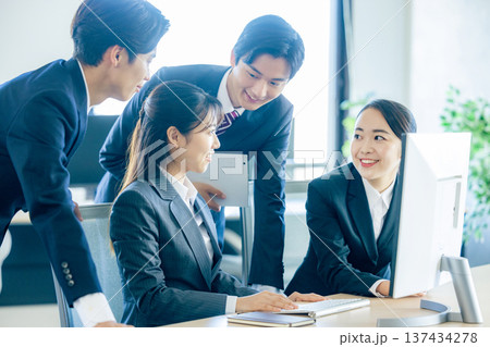 オフィスでパソコンに向かいながらミーティングする新入社員の男女の会社員