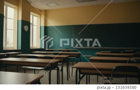 静まり返った放課後の教室。ローアングルから見上げる机と椅子の風景