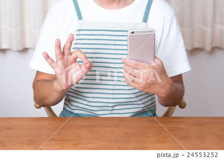 主婦(スマートフォン、OKポーズ)