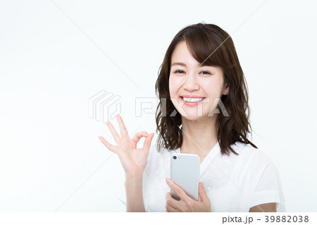 若い女性(スマートフォン、OKサイン)