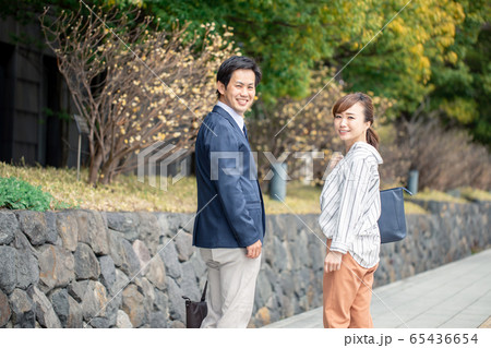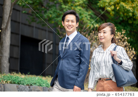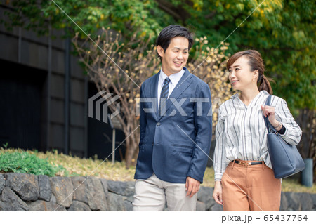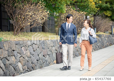 歩いて通勤する会社員の夫婦
