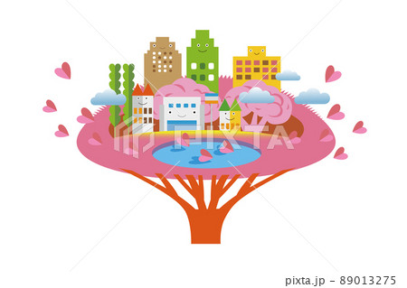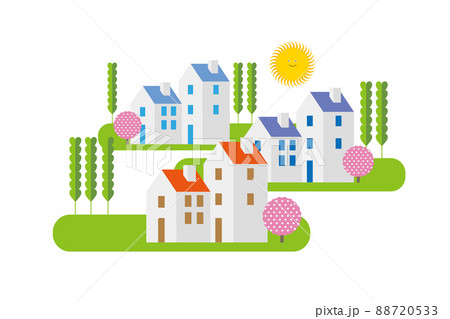 油彩風のエンボス。美しい街並みと暮らしの風景。人々が明るく暮らせる自然と住宅が溶け込む街づくり。